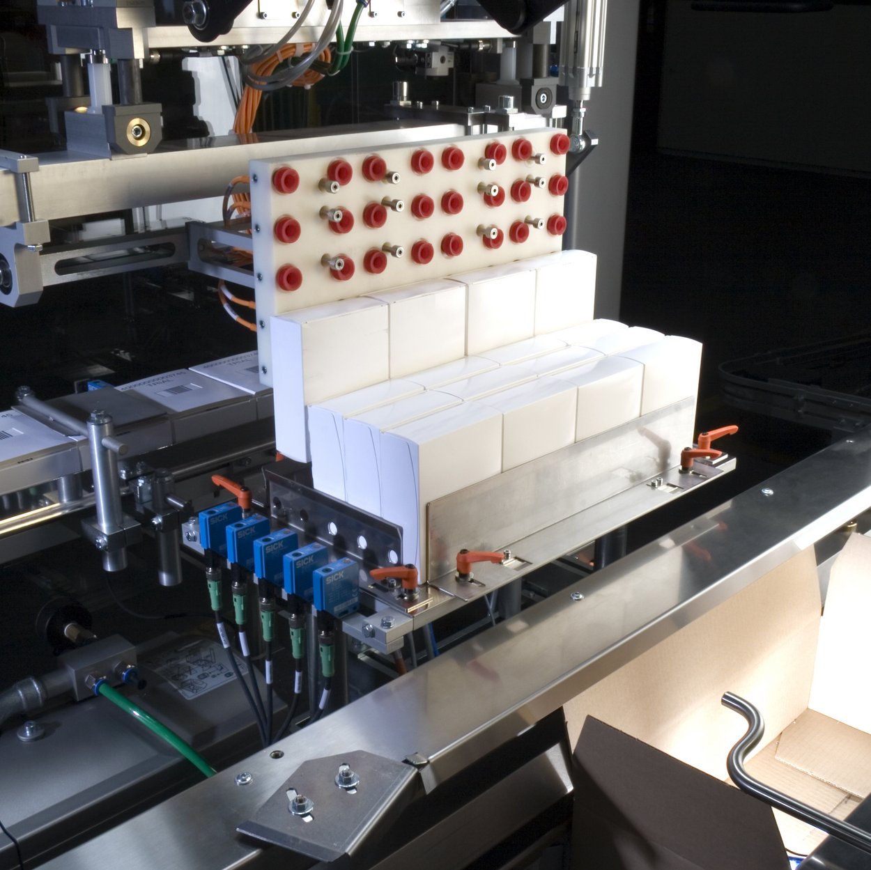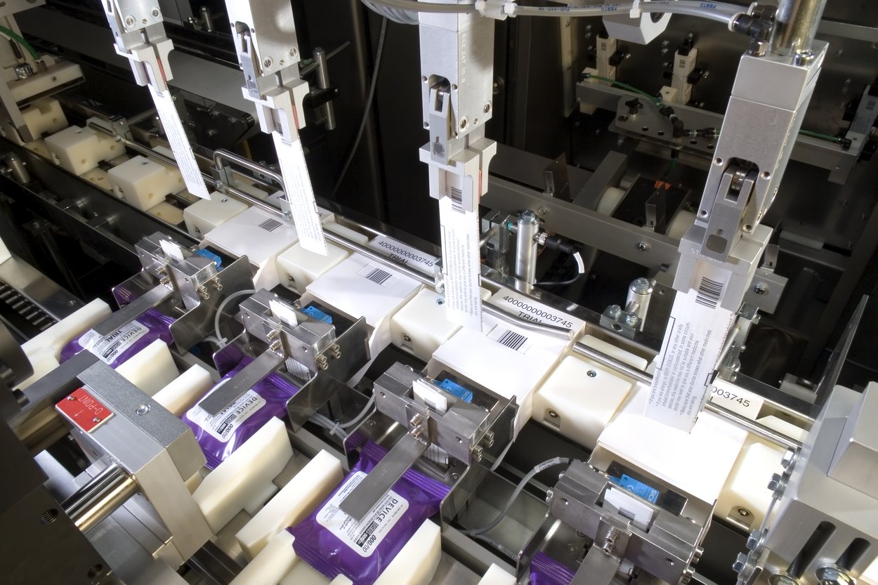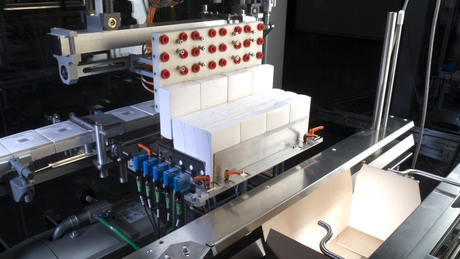 Die Primärkartonierung arbeitet mit vorverklebten Faltschachteln. Diese werden dem Magazin entnommen, geöffnet und dem Roboter präsentiert, der die Produkte samt einem Beipackzettel in eine aufgerichtete Sideload-Faltschachtel schiebt. Die Faltschachteln werden verschlossen, über Eck etikettiert und abschließend palettiert.