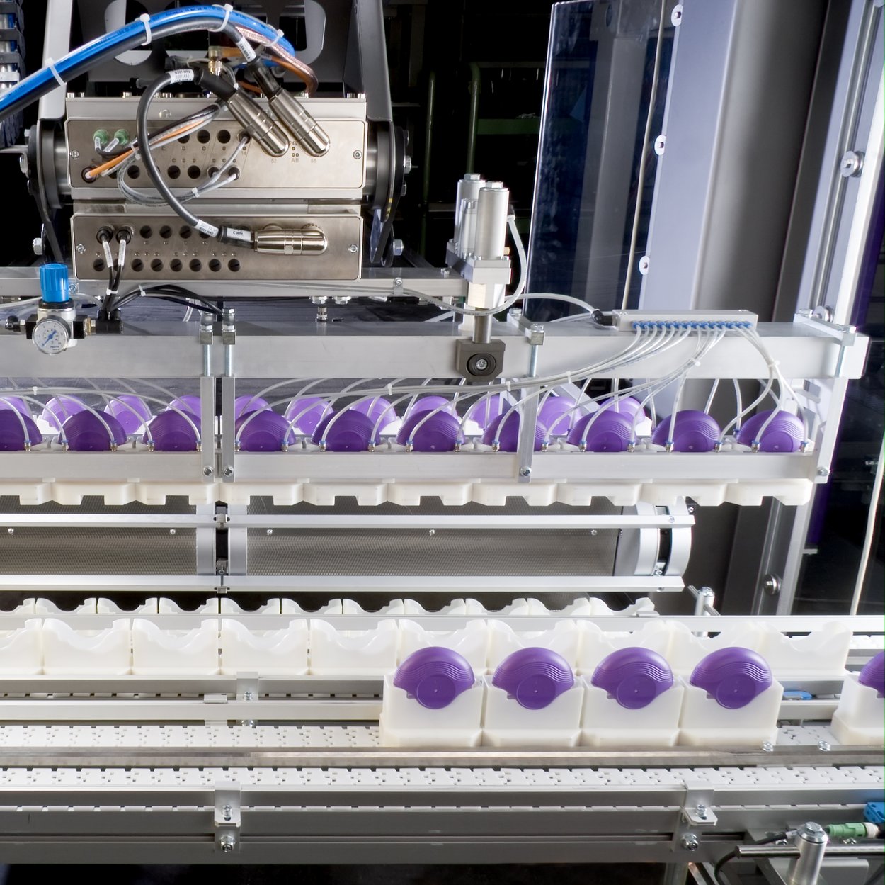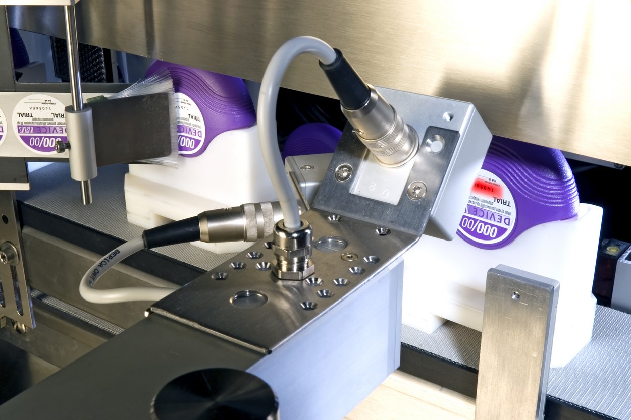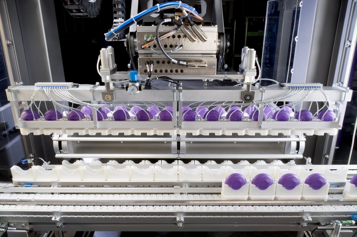 Die Komplettanlage übernimmt die montierten Inhalatoren und verpackt sie versandfertig. Eine Teilmaschine mit F2-Roboter dient als Speicher für beladene und leere Produktträger und gewährleistet einen kontinuierlichen Montage- und Verpackungsprozess. Die Speicherkapazität liegt bei ca. zehn Minuten bei einer Leistung von 80 Inhalatoren pro Minute. Im Anschluss drucken und applizieren Etikettensysteme beidseitig millimetergenau runde Etiketten auf die Außenseite der Inhalatoren. Die Daten auf den Etiketten werden nach dem Applizieren durch eine Kamera verifiziert.