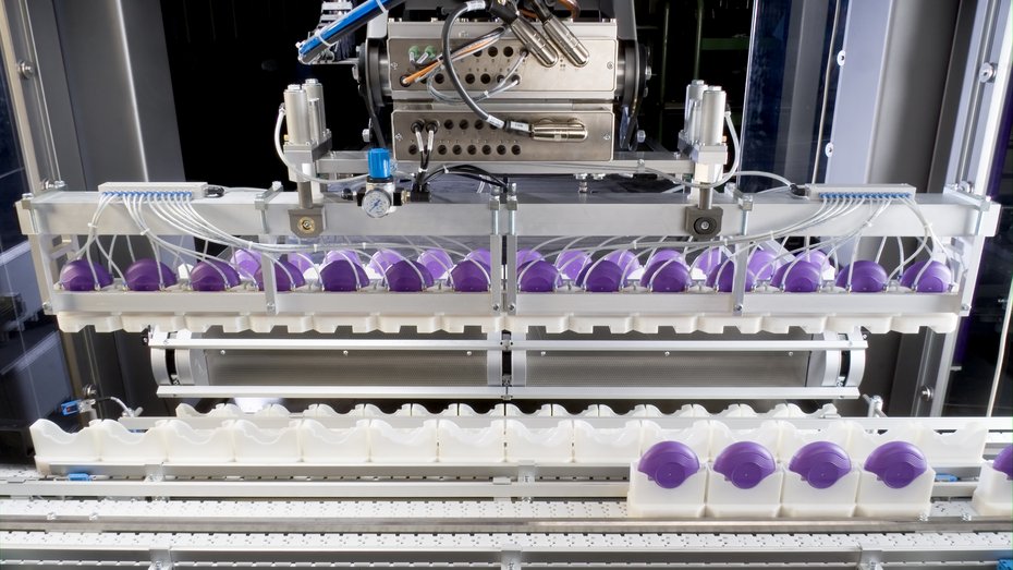 Eine weitere Teilmaschine mit F2-Roboter belädt die Produktkette der Schlauchbeutelmaschine und transportiert die entladenen Produktträger zurück in den Kassetten-Kreislauf. Die mit Aluminium bedampfte Folie wird noch vor dem eigentlichen Schlauchbeutelprozess etikettiert, um ein faltenfreies Ergebnis zu erhalten. Die Inhalatoren werden dann in die Schlauchbeutelfolie luftdicht verpackt.