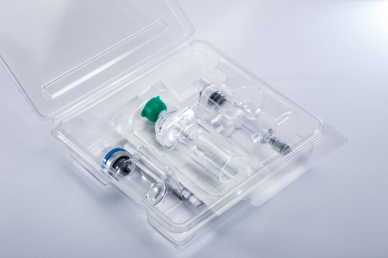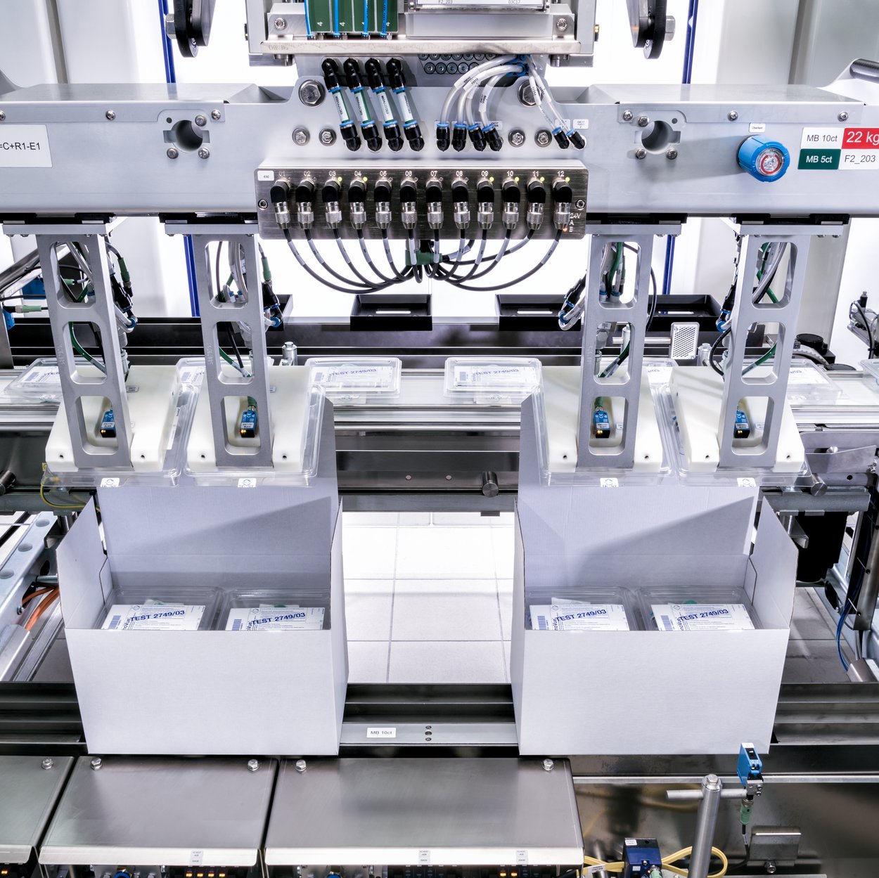 Zu Beginn werden die Clamshell-Trays dem Magazin entnommen, entstapelt und auf dem Transmodul positioniert. Dem gleichen Magazin werden zeitversetzt die Leaflets entnommen und in den Trays abgelegt; diese Kombination in einem Magazin ist platzsparend. Im nächsten Schritt legt ein Pick-and-Place-Roboter die erste Komponente des Kombi-Kits – eine Kolbenstange – im Tray ab. Danach werden Transfersysteme als zweite Komponente vereinzelt und von einem F4-Roboter zum Überprüfen der aufgebrachten Daten vor einer Kamera positioniert. Entsprechen die Daten auf dem Etikett den Vorgaben, wird es in das Clamshell-Tray eingelegt.