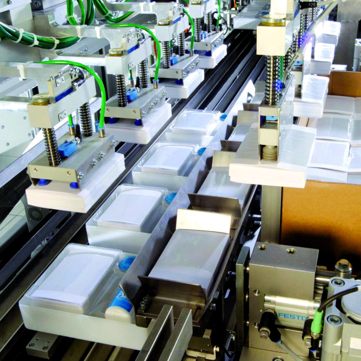 An der nächsten Station werden die Trays an definierter Stelle oben und unten mit Etiketten beklebt. Die korrekte Ausrichtung ist wichtig für die perfekte Verkaufspräsentation und gewährleistet zudem, dass der aufgedruckte Barcode immer an der identischen Stelle vorzufinden ist. Eine optische Kontrolle prüft dies und schleust gegebenenfalls fehlerhafte Packungen aus. Im Anschluss erhalten die Trays eine Folienverpackung in Einschlagtechnik.