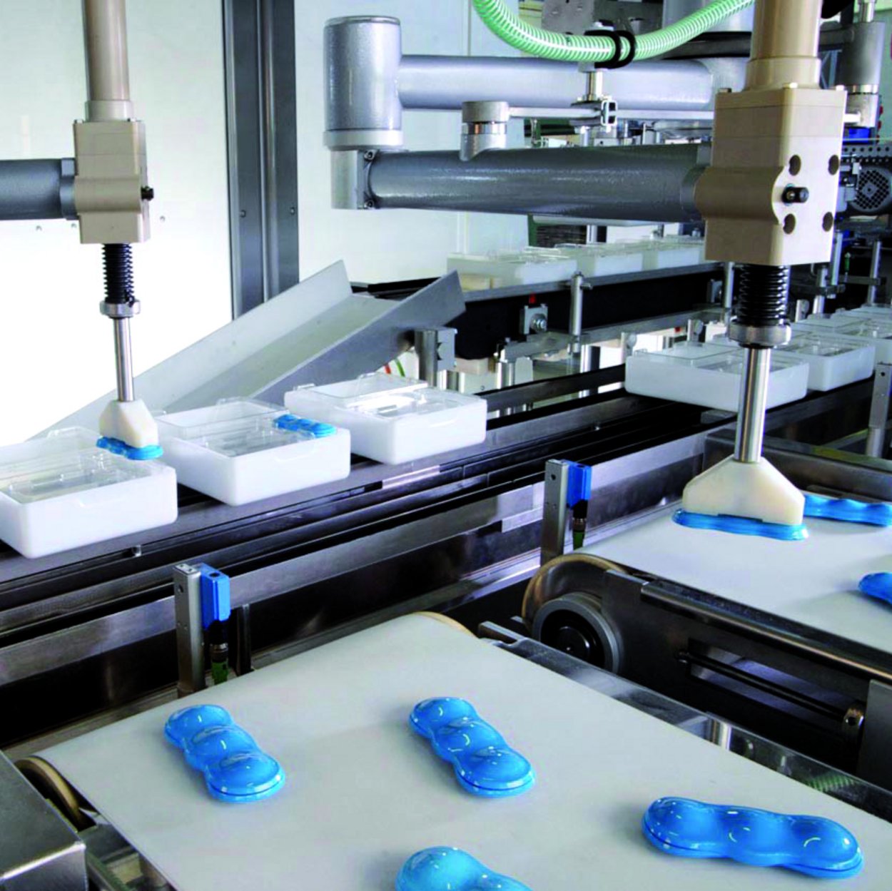Das zuvor in das Formteil eingelegte Tray wird bestückt: Die Tagesdosisbehältnisse werden automatisch vereinzelt und zur optischen Bilderkennung der Pickerstation transportiert. Das Faltblatt wird noch vor den Kunststoffdosen eingesetzt; Letztere erreichen ihre Pickerstation aufrecht stehend. Noch vor dem Übersetzen werden sie in die Waagrechte gedreht – im Sinne der perfekten Verkaufspräsentation werden die Dosen von zwei Walzen gedreht, bis eine optische Kontrolle die gewünschte Ausrichtung des Markenschriftzugs erkennt. Danach wird das Booklet eingelegt und das Tray mit einem Deckel verschlossen.