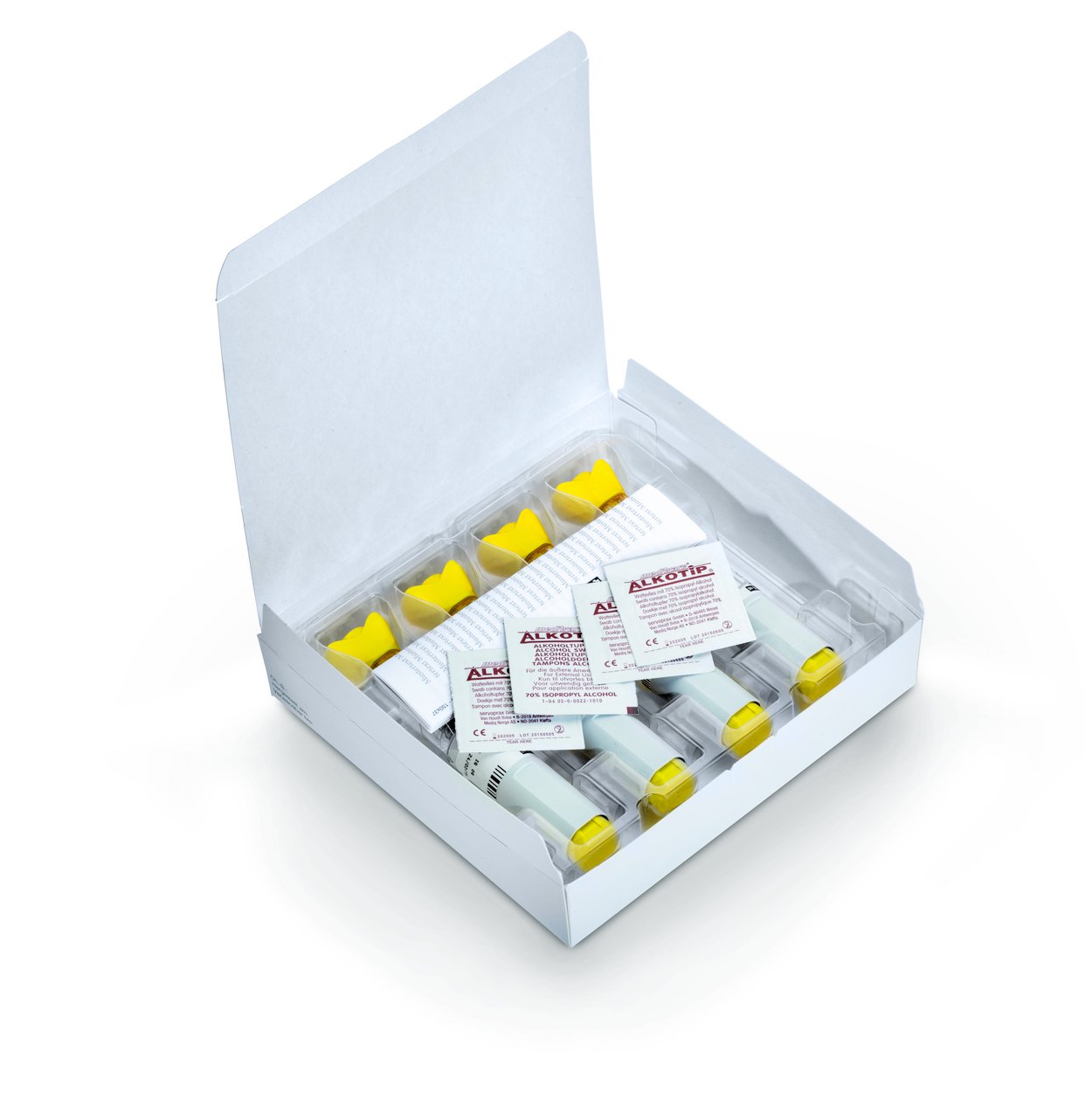 - Verschiedene Vialgrößen: Vials in 1er-, 2er- und 10er-Packungen stehend/liegend in Gefache,
