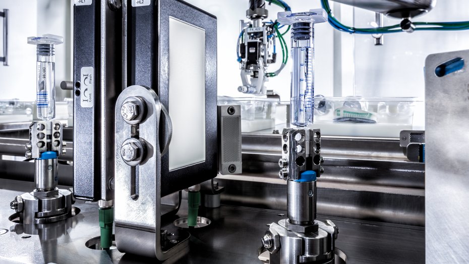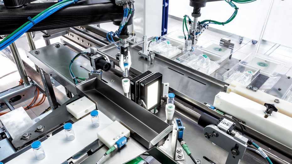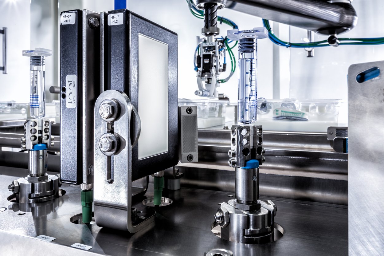 Next, a pick-and-place robot inserts the first component of the combo kit – a plunger rod – into the tray. Transfer systems then feed the second component, which is singled out and positioned by an F4 robot in front of a camera for data verification. If the label data matches the specified requirements, the component is placed into the clamshell tray.