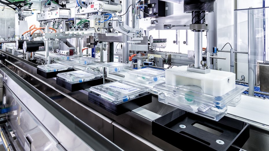 The fully automated packaging process consists of three main operations: loading and labeling the trays, followed by their cartoning into multi-boxes. Precise placement and securing of each individual component within the trays, achieved through customized robotic tooling, ensures gentle and damage-free product handling.