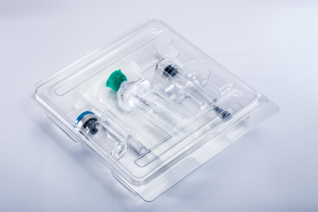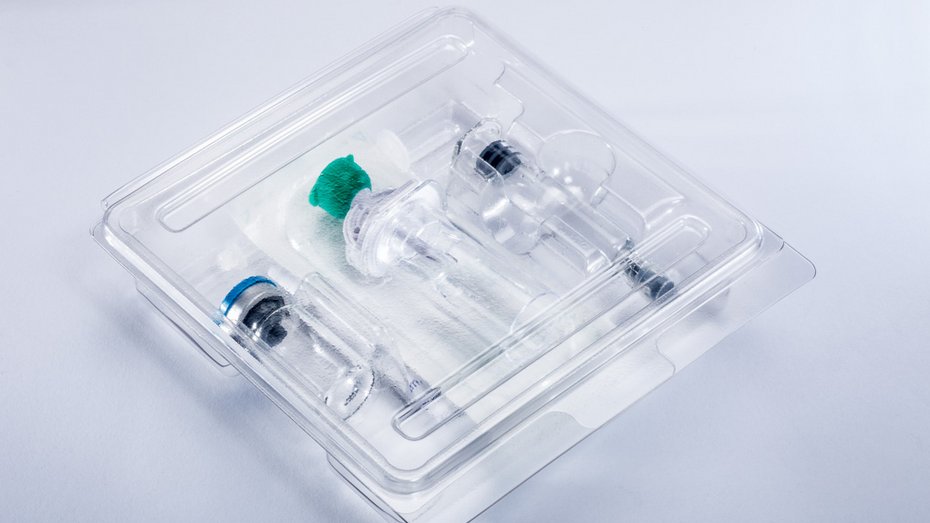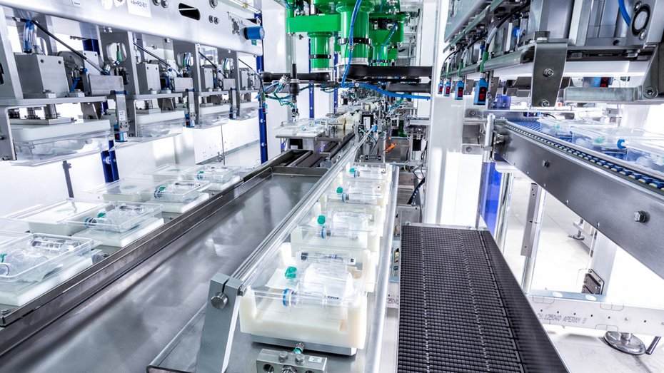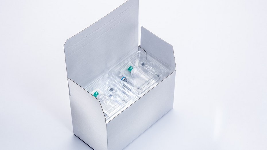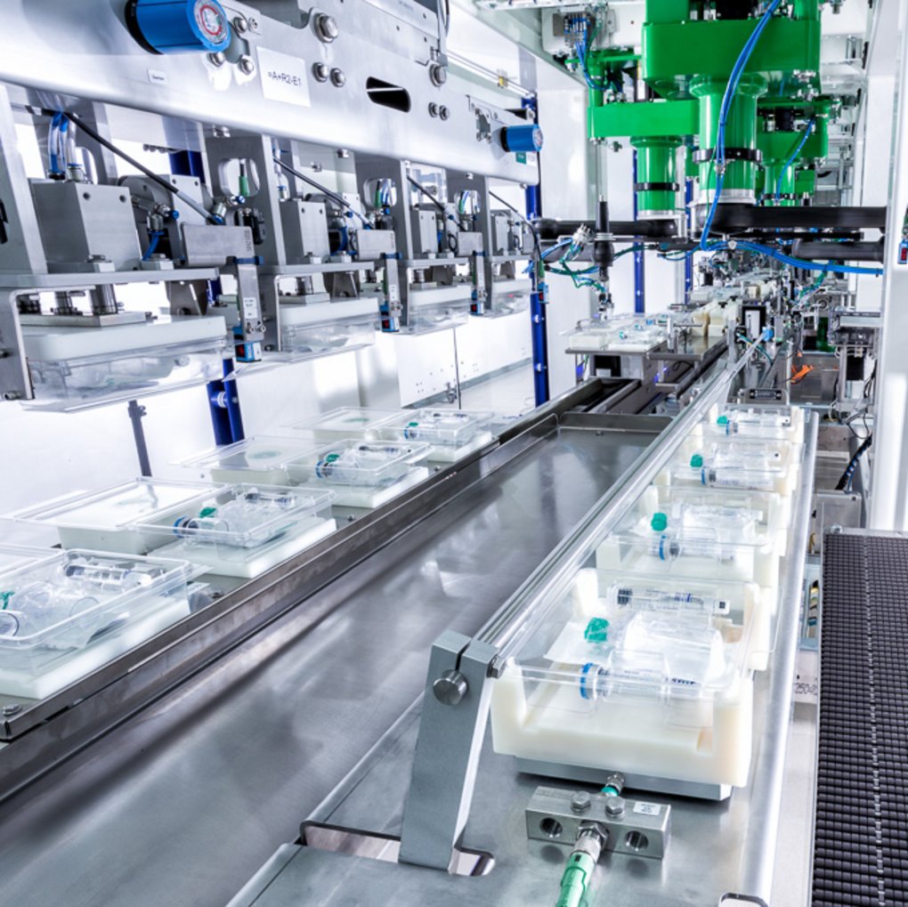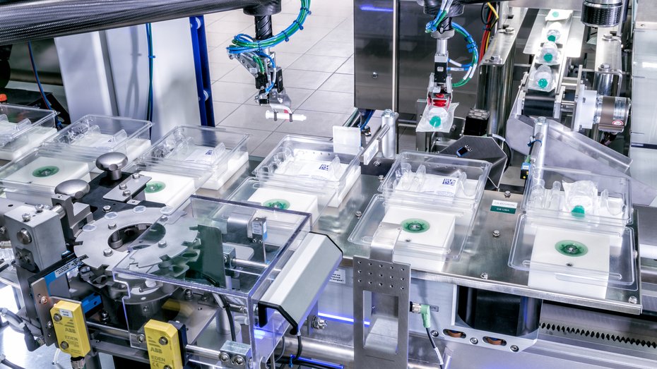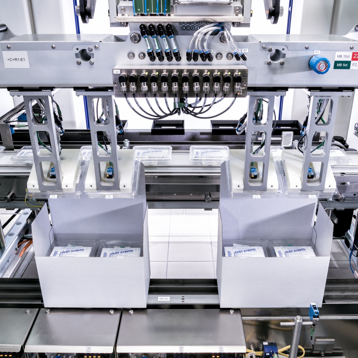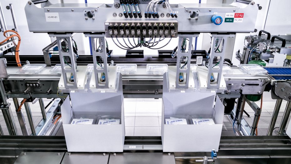 The system packages a multi-component combination kit containing contrast media for ultrasound examinations. This task requires not only precise singulation and accurate alignment of the components but also the integration of a centralized communication system for product serialization.