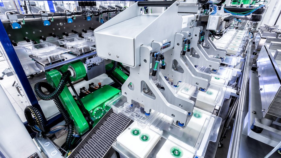 A stand-alone labeling unit applies up to three labels after the clamshell trays have been loaded and closed. The subsequent cartoning process begins with destacking the carton blanks and erecting the cartons. An F4 robot pre-groups the incoming labeled clamshell trays and transports them to the loading station. Once inserted into the cartons, a label is applied and the carton is securely closed.