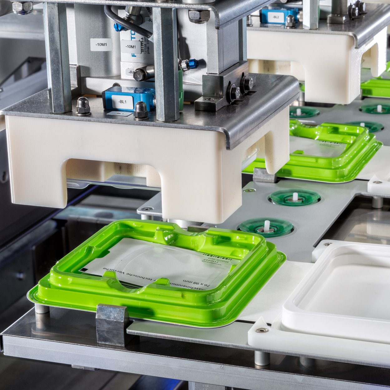 Outstanding sealing quality between trays and carton inserts is achieved through ultrasonic sealing using a block sonotrode. This approach enables simpler handling and lower life-cycle costs, resulting in long-term savings. Each block sonotrode can be individually and easily configured via the Schubert operator terminal. The independent control of the block sonotrodes allows for precise monitoring of the quality of each seal.
