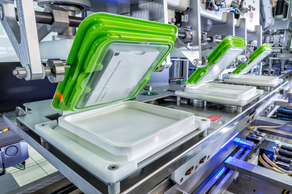 Different sizes of the peel-seal bags, as well as various tray cavities and colors, can be switched quickly: Despite varying patch sizes, only the loading tool on the F2 robot needs to be adjusted. All other tools are universally designed for all packaging sizes, eliminating the need for additional format parts.