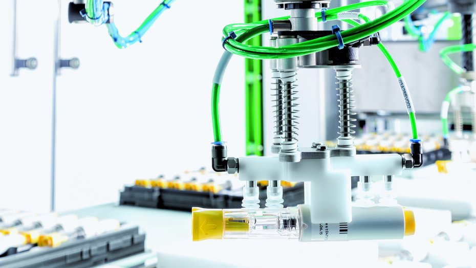 During the packaging of the devices, the thermoformed trays are first produced in Schubert’s thermoforming module. Unlike comparable solutions, a mother tray with a defined number of individual trays is formed initially and only separated later in the process. Product grouping already takes place on Transmodules with the help of F4 robots in the product feed area.