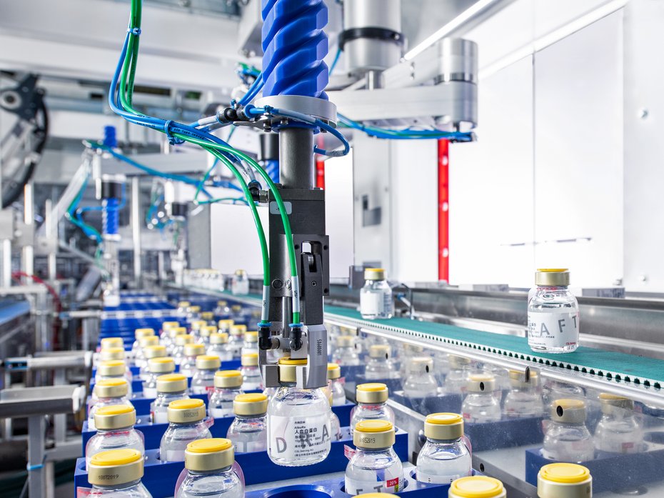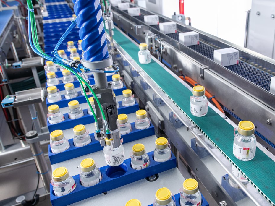 A TLM-F2 robot takes the erected cartons from the Transmodul and places them onto a vacuum conveyor. Another TLM-F2 robot picks up the bottles from the other Transmodul and inserts them into the erected cartons.