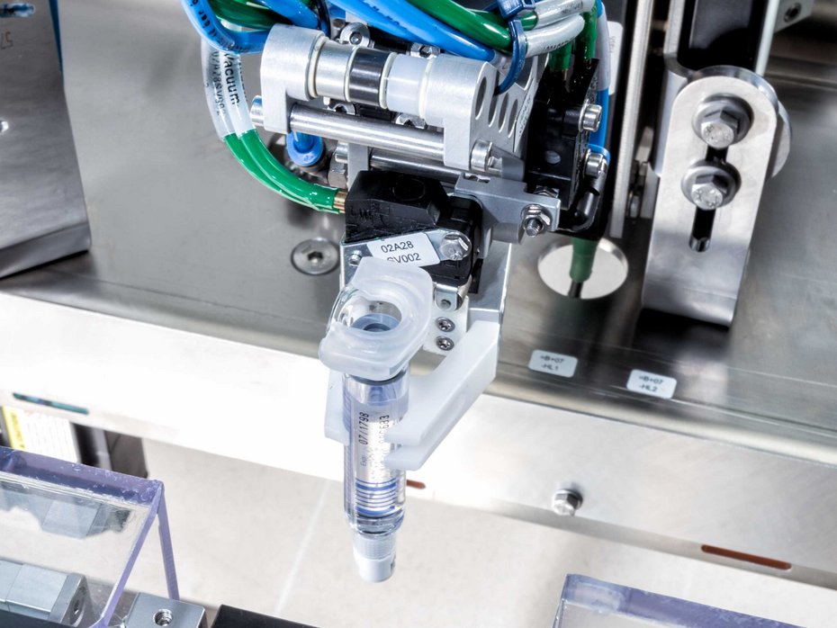 Another TLM-F2 robot takes the pre-grouped syringes (head-to-tail) and places them into the cartons (into the compartments).