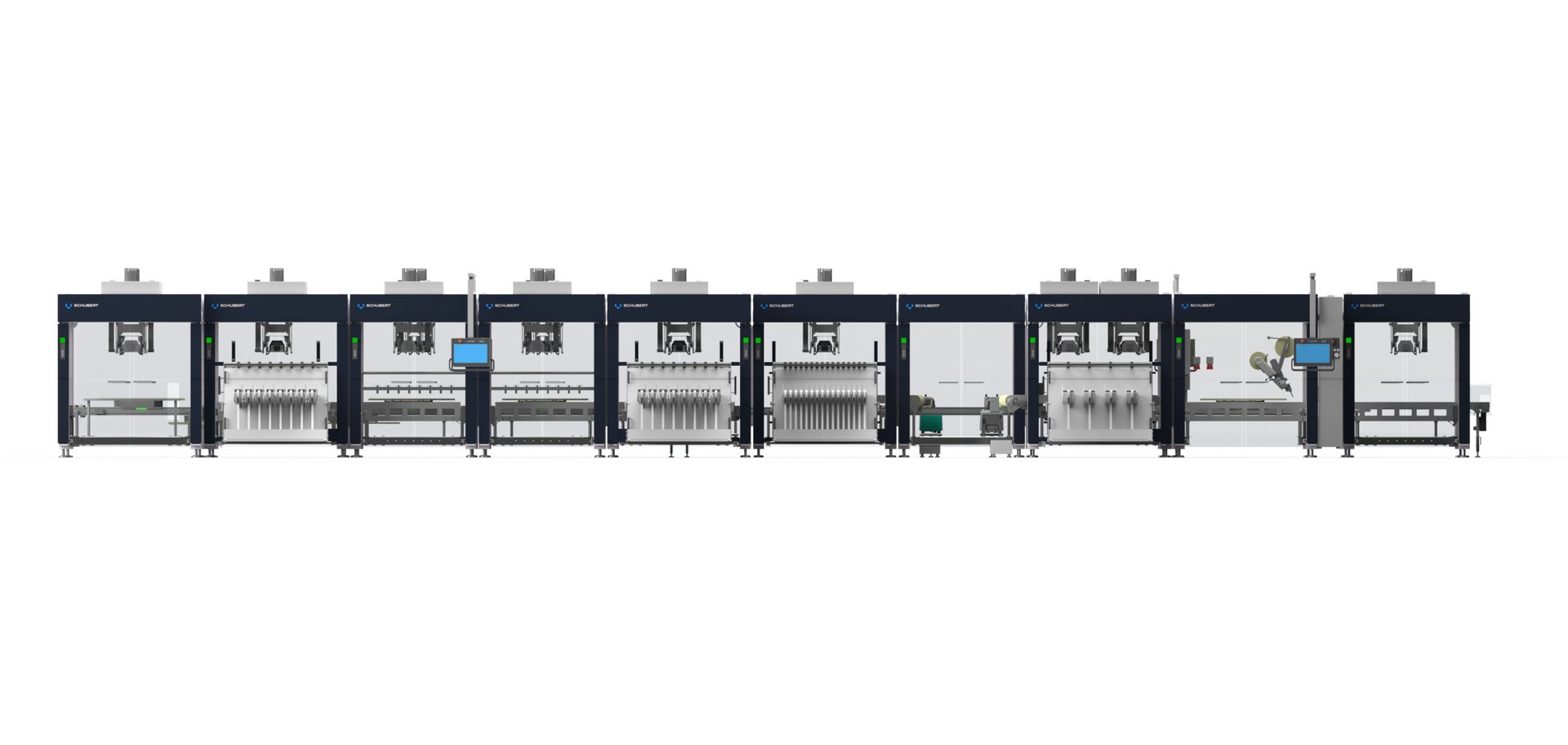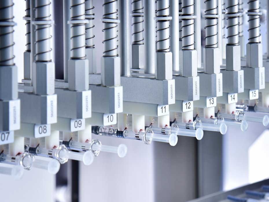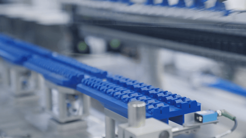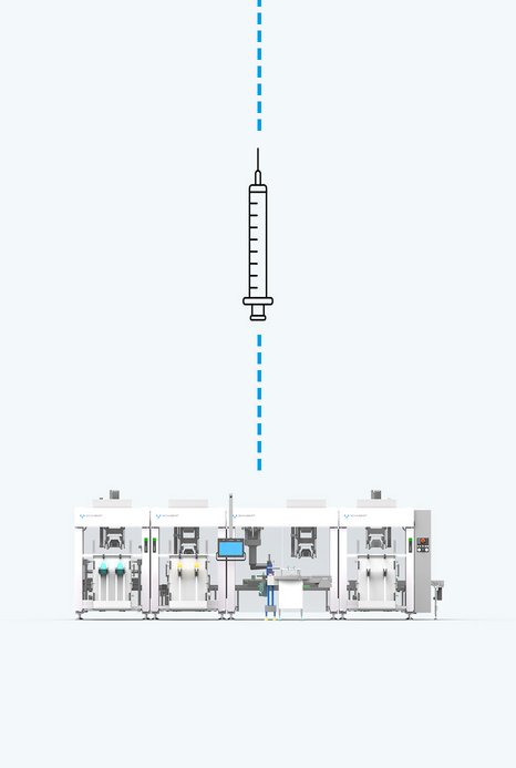 The syringes are automatically fed into the machine. Alternatively, manual feeding is also possible, for example in rework processes. The syringes enter the machine in a vertical orientation and are tilted 90° by a TLM-F2 robot, then placed horizontally on a rotary table in formations.